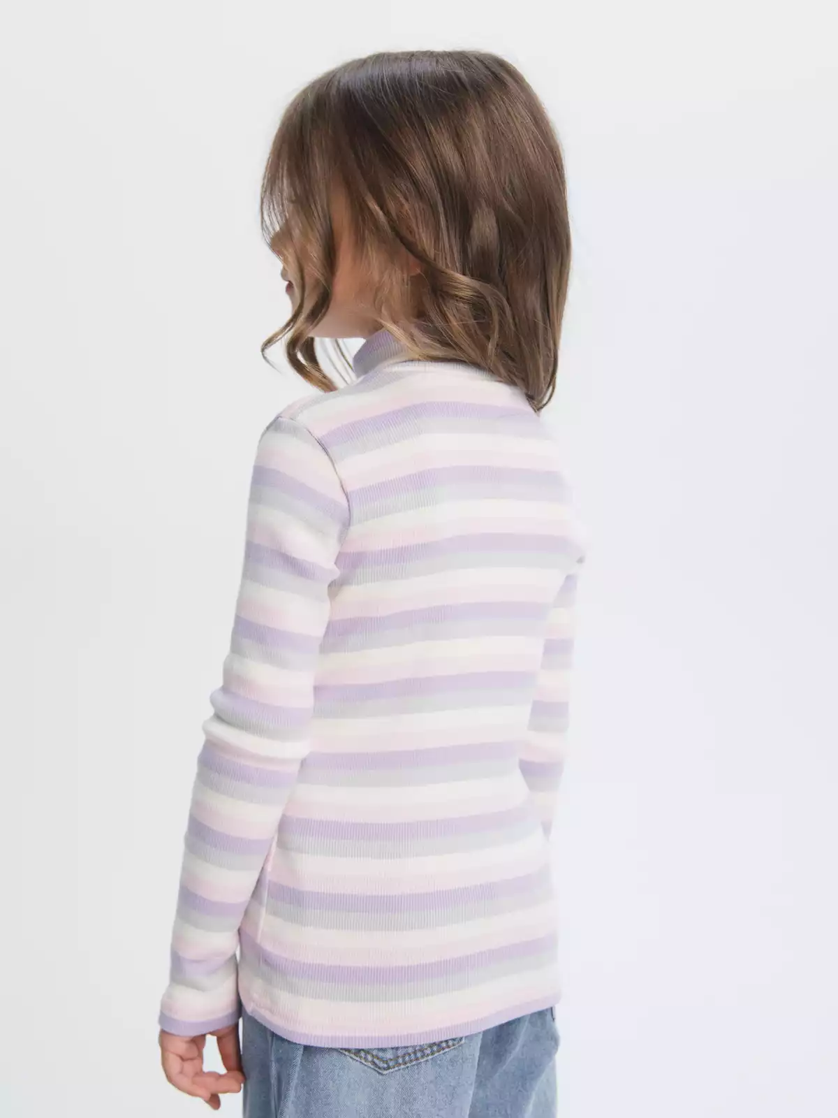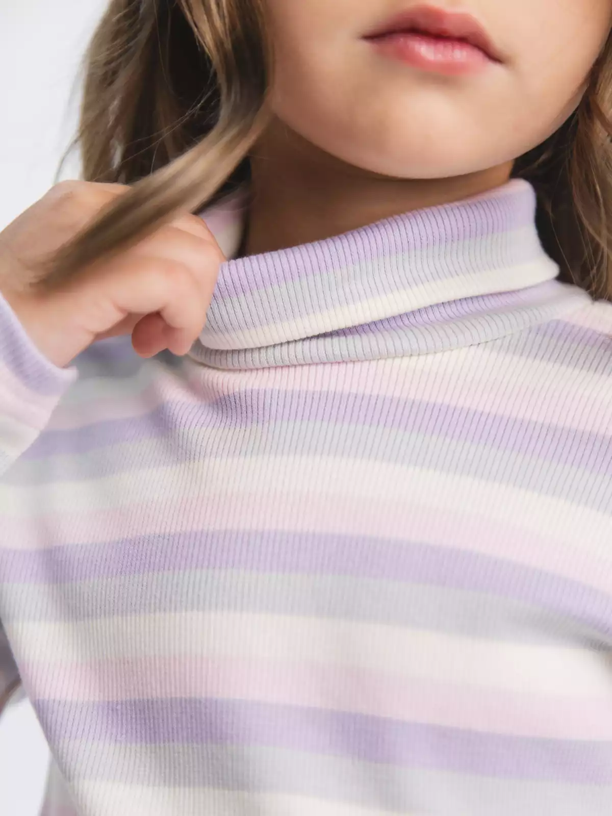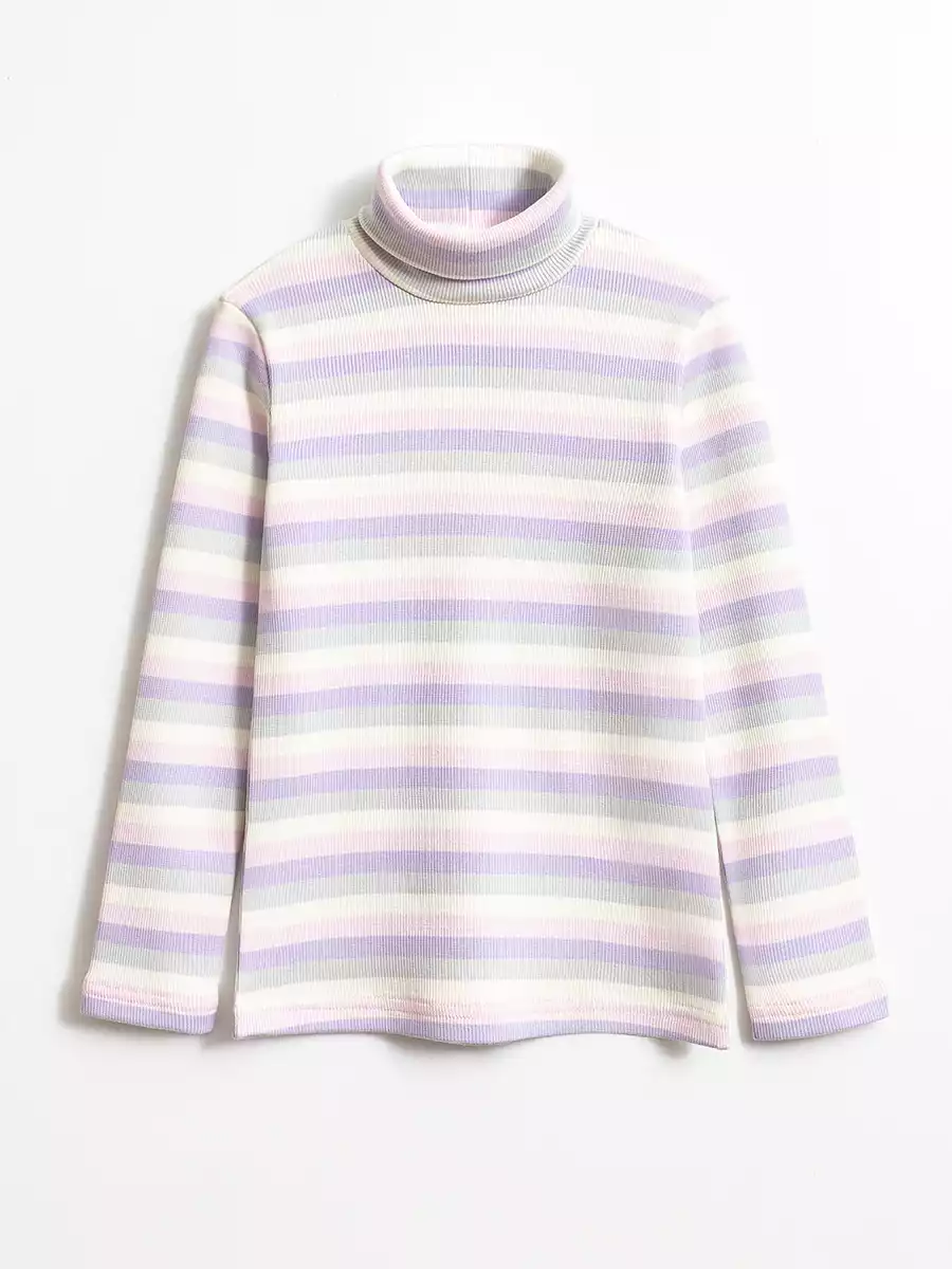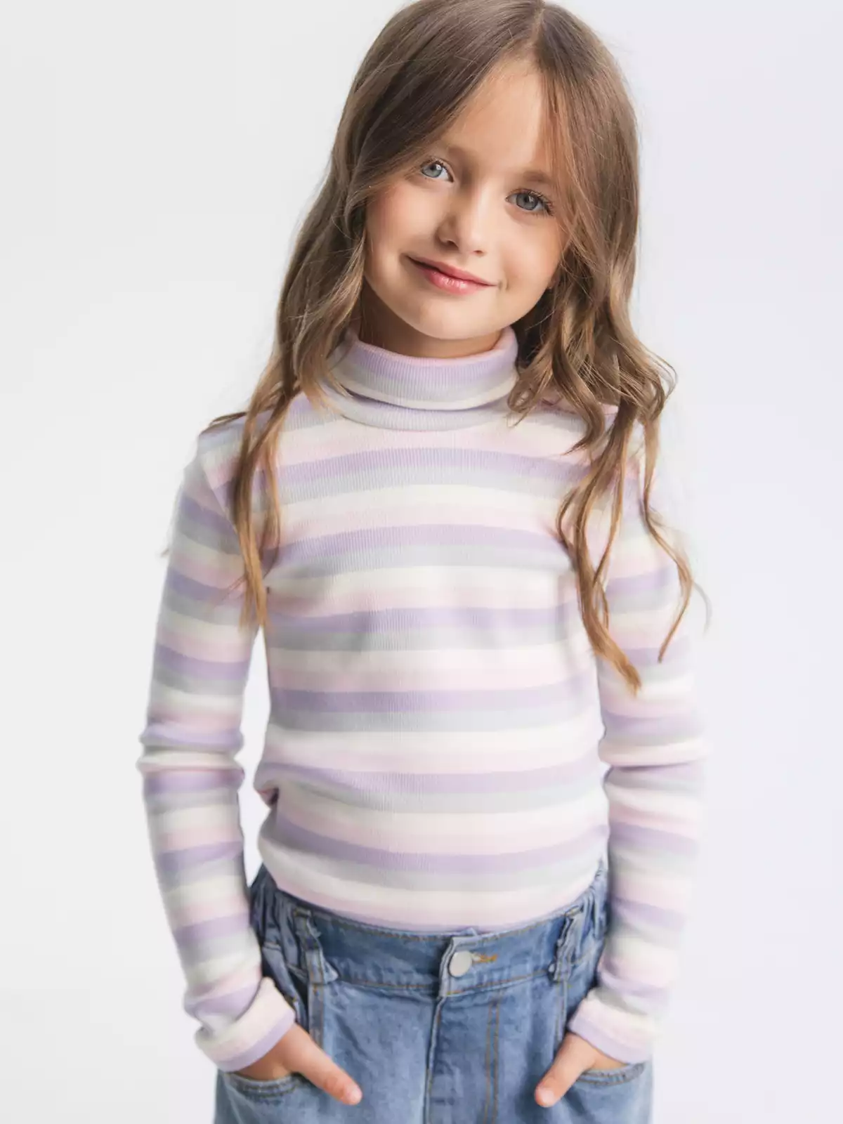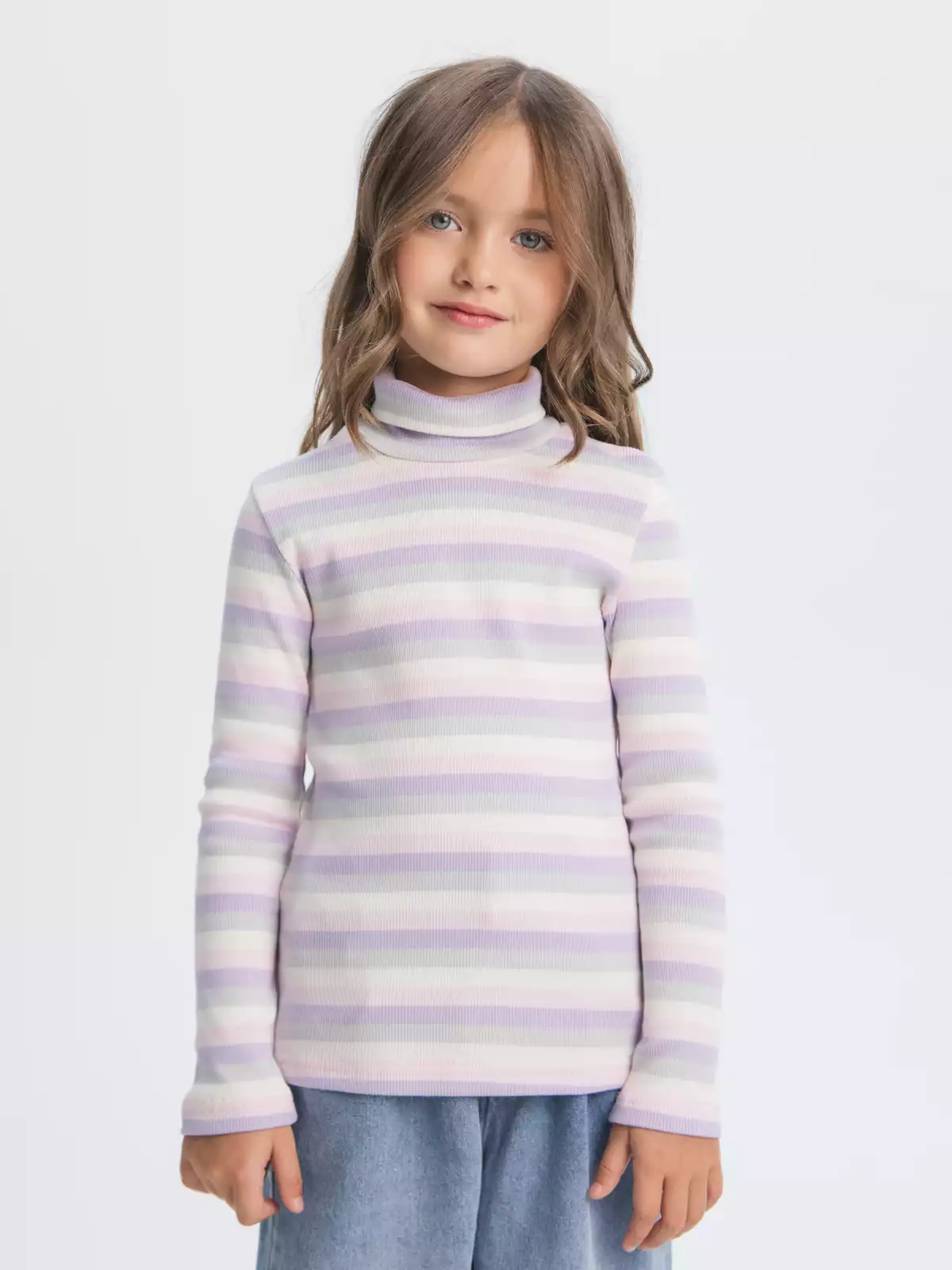 Теплая, мягкая и приятная к телу водолазка в полоску,с начесом согреет вашего ребенка в холодное время года. Материал: кашкорсе, состав: 95% хлопок, 5% эластан. Модель с длинными рукавами и воротником-стойкой с отворотом. Отличная базовая вещь на каждый день.