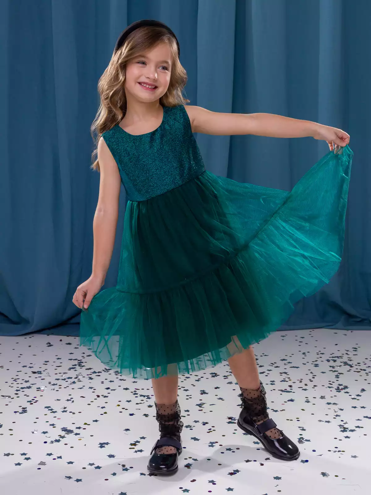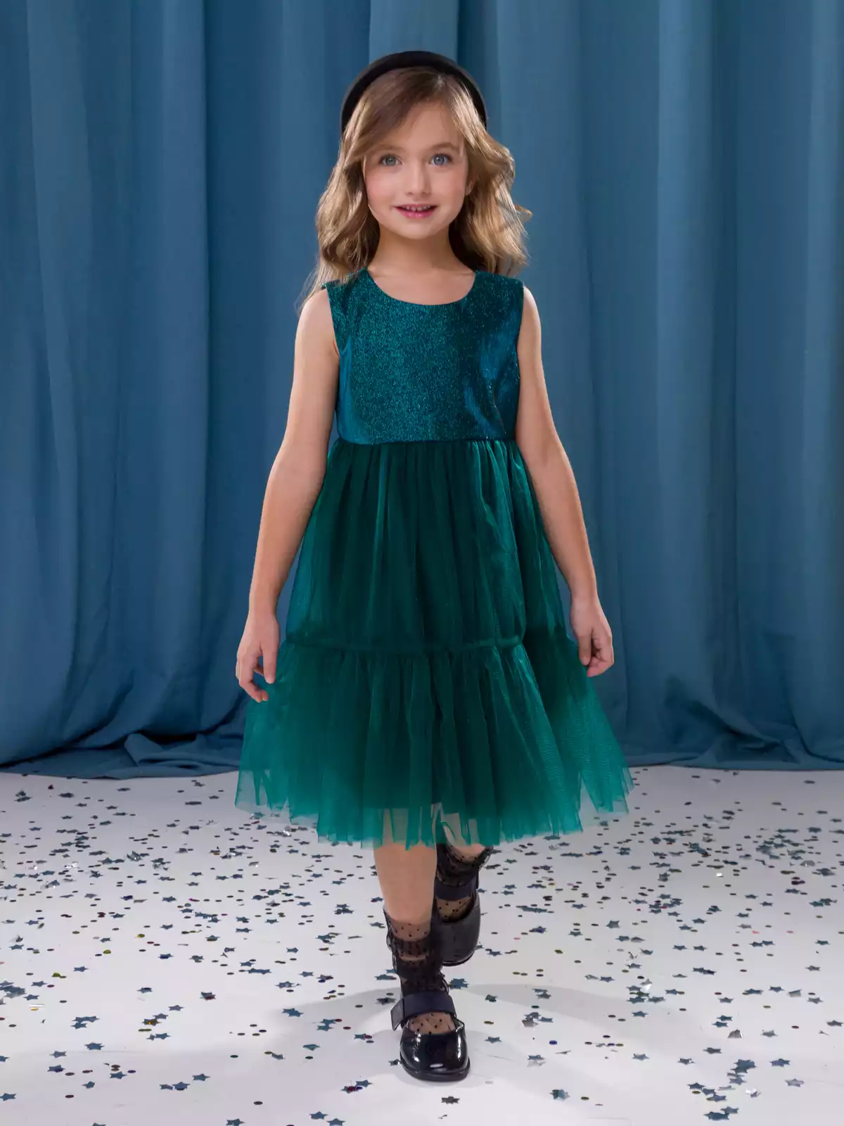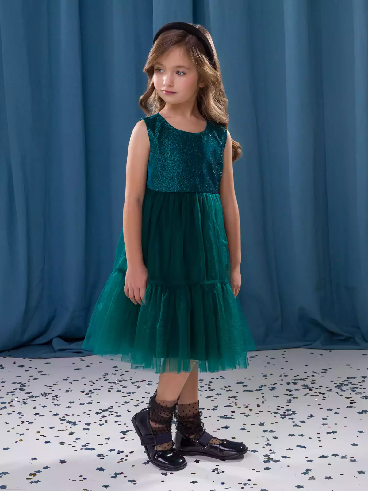 Очаровательное платье изумрудного цвета для девочек. Модель идеально подходит для любого торжества, может стать костюмом елочки на новогоднем празднике. Юбка многослойная, что придает образу маленькой модницы дополнительную легкость. Красивое и нарядное платье для девочек несомненно очарует любую малышку и порадует окружающих. Данная модель отлично подойдет на Новый Год, на утренник, в детский сад, для фотосессии, школьного праздника, Дня Рождения и любого праздничного мероприятия.