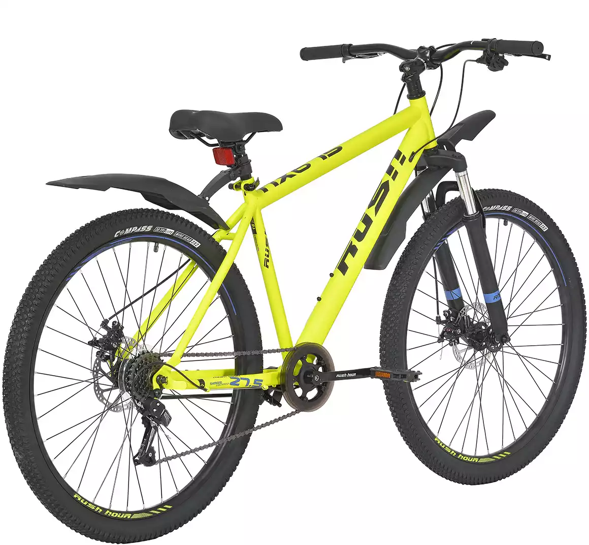 Горный велосипед RUSH NX675 27,5 дюймов с дисковыми тормозами для взрослых. Рама хардтейл с гарантией 5 лет изготовлена из Hi-ten стали с применением технологии техноформинга и внутренней проводки тросов. Пружинно-эластомерная вилка ход 80 мм. Трансмиссия 6 скоростная, задний переключатель SHIMANO TZ500, на руле манетки TS38 от тайваньского бренда Microshift. Двойной алюминиевый обод рассчитан на нагрузку до 120 кг. Каретка картридж с промподшипниками. Сиденье регулируется по высоте. Вес велосипеда 15,5 кг. На нижней трубе есть крепеж для держателя бутылки или насоса. Крылья, подножка и защита цепи в подарок.